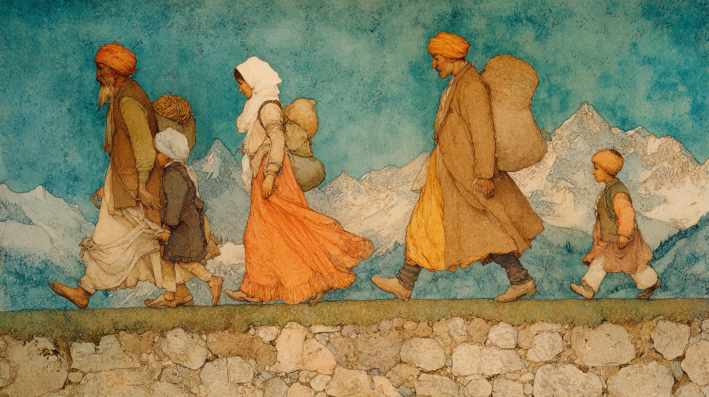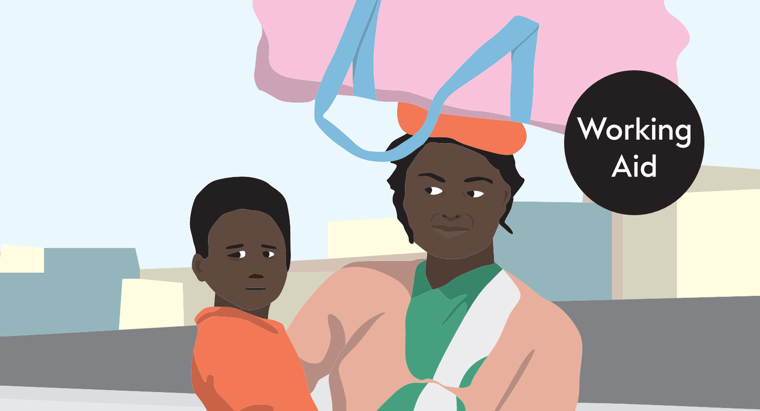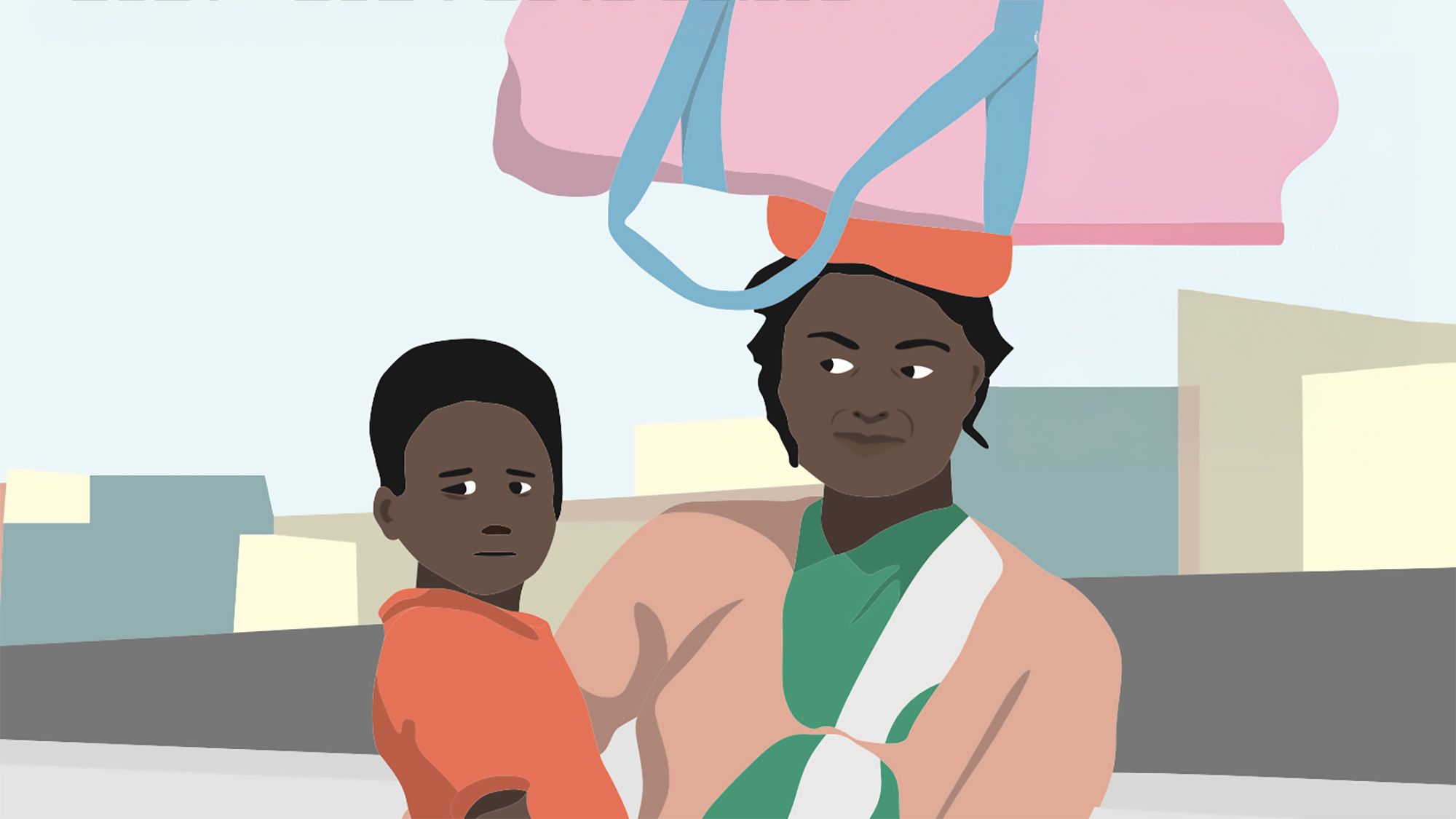 Graphic representation of a mother with a travel bag on her head holding her son in her arms. Somewhere in Africa.